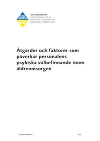 Statens beredning för social och medicinsk utvärdering, SBU 2025SBU har sammanfattat och kommenterat en systematisk översikt som undersöker vad som påverkar det psykiska välbefinnandet hos äldreomsorgspersonalen. Gott ledarskap, tillgång till kompetensutveckling och gott om resurser, men också policy, reglering, struktur och styrning på arbetsplatsen har inverkan på hur personalen mår. 89 studier ingår i översikten, varav nästan hälften var från USA.