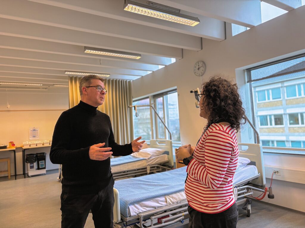 Jonas Olofsson i samtal med kollegan Catrin Kudo, i universitetets kliniska träningscentrum. Foto: Nathalie Olofsson