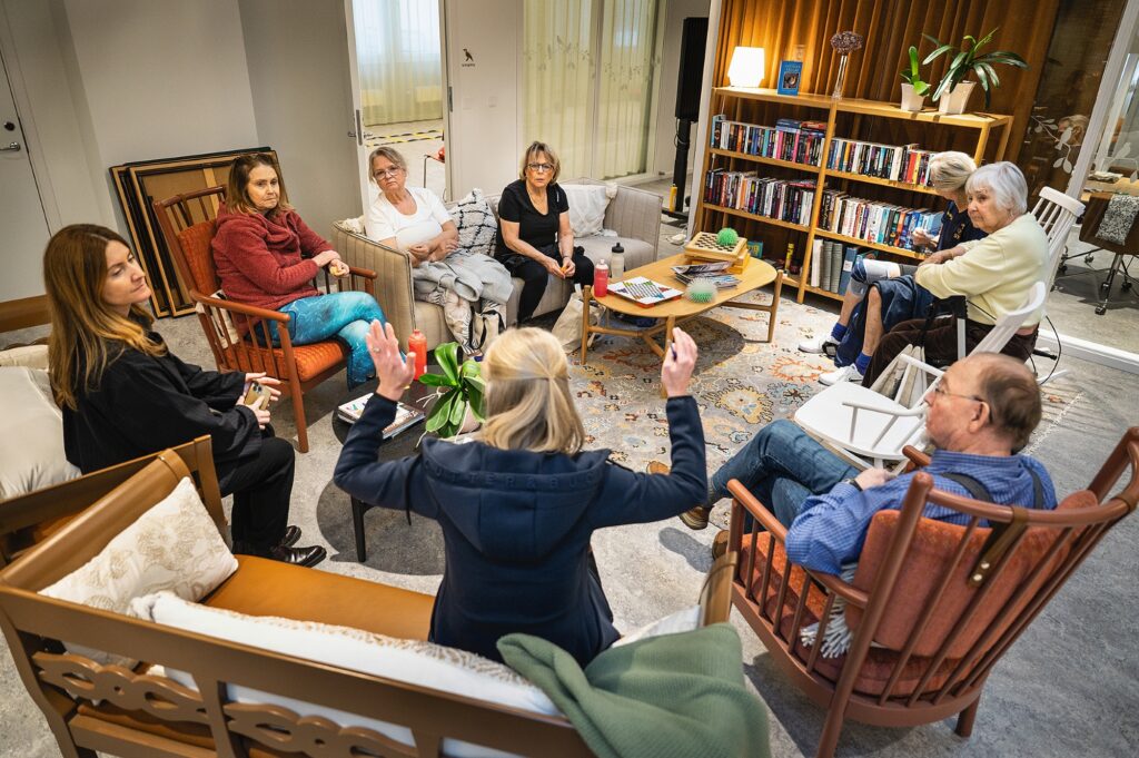 I en cirkel runt träningsledaren Helena Levin står sju seniora Sollentunabor och värmer upp till musik.