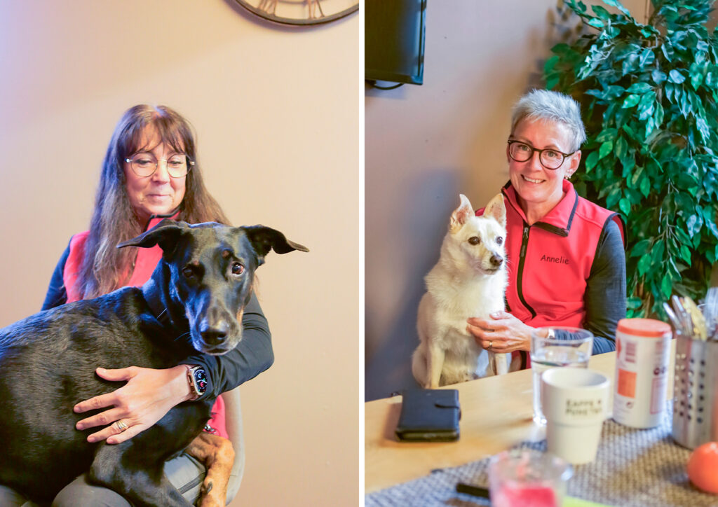 Maria Möller berättar att Svea är en lugn hund, som tycker »nu är det du och jag«. Annelie Hultin och kollegan Maria Möller har ett eget kontor med kök, där hundarna kan vara med. Foto: Enikö Szurkos